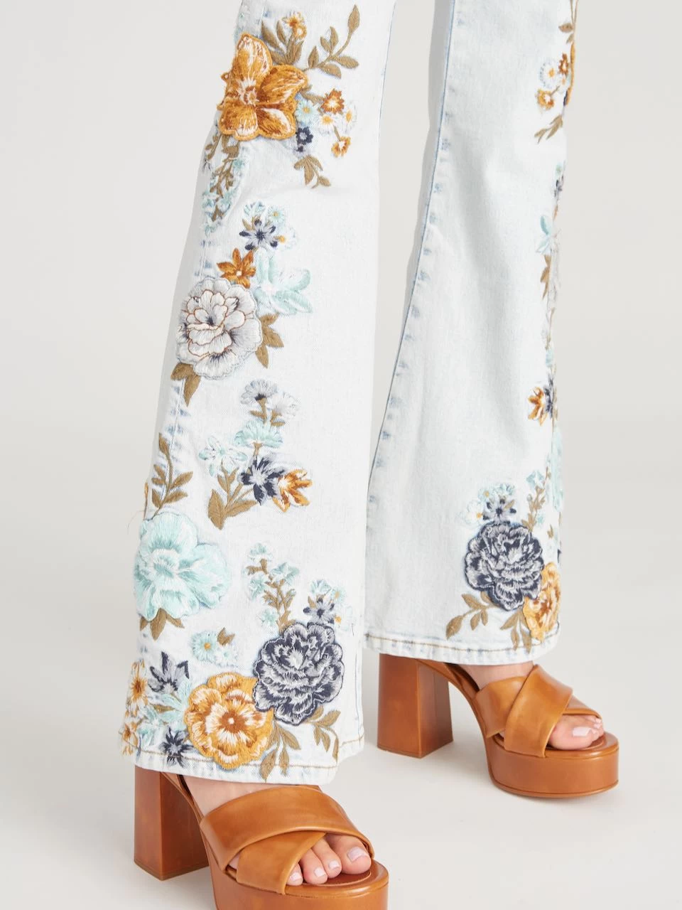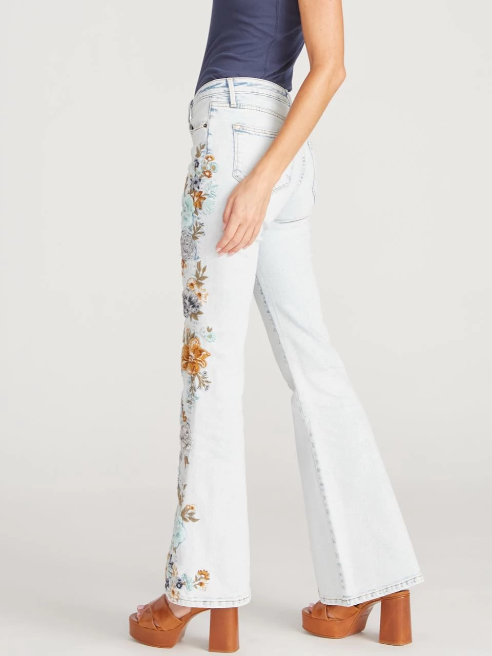 Driftwood Jeans βFarrahβ (Aqua Dusk) β gorgeous flared jeans in light wash denim featuring exquisite floral embroidery, four pockets, zipper closure. Stunning fit, stretchy medium weight fabric. Spectacular bohemian style, indeed!