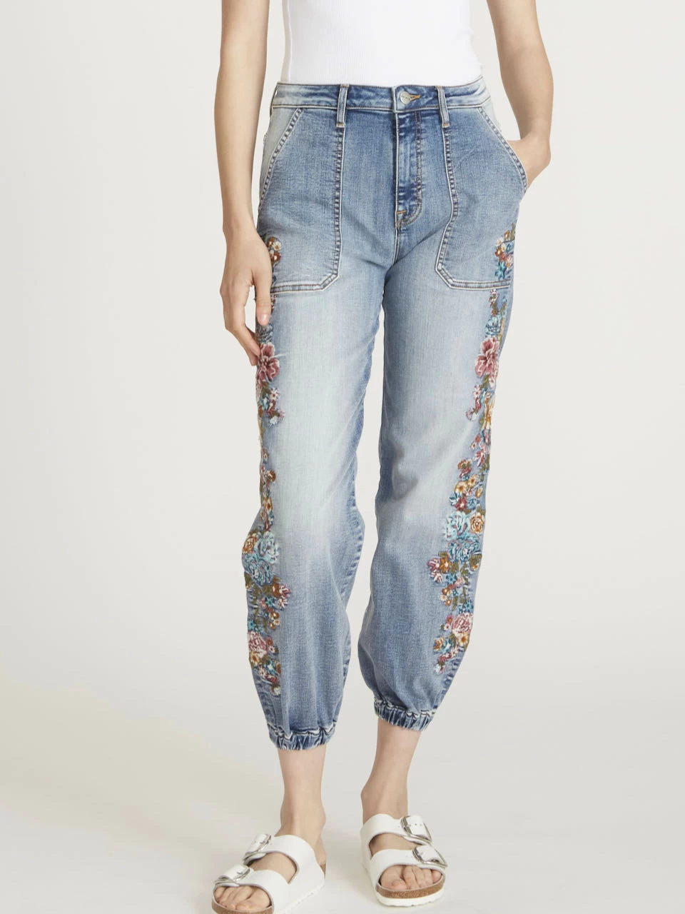 Driftwood Jeans “Jogger” (Summer Vines) – a piece of art jogger denim trousers in medium wash denim in bohemian style, featuring spectacular floral embroidery design, four pockets, elastic hems, cropped length. Easy comfortable fit, stretchy and super soft medium weight fabric. Must have in your wardrobe, indeed!