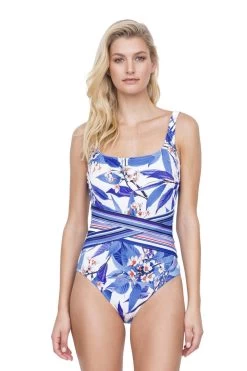 Gottex Swimsuit βSakuraβ β gorgeous one piece blue swimming suit in floral design in textured (ribbed) fabric with square neckline, criss cross overlay design at waist, tummy control, soft cups, low back, adjustable straps. Very flattering fit. Stunning style, indeed!